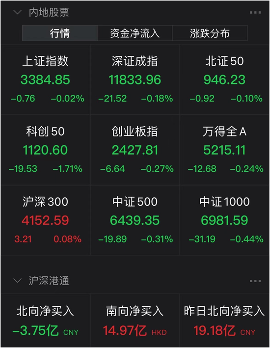 周二,三大指数震荡整理,沪指偏强。截至午间收盘,上证指数微跌,深证成指跌0.18%,创业板指跌0.27%。北向资金半日净流出3.75亿元。