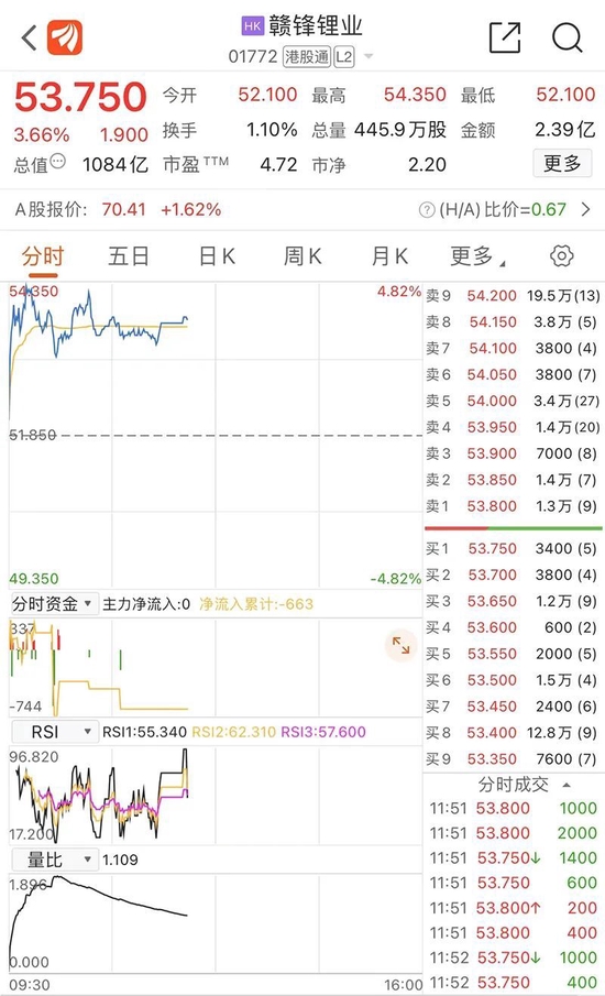 锂电池概念股早盘多数上扬,截至发稿,赣锋锂业涨3.66%,报53.75港元/股;天齐锂业涨2.09%,报58.5港元/股;彩客新能源涨1.48%,报1.37港元/股;超威动力涨0.6%,报1.69港元/股。