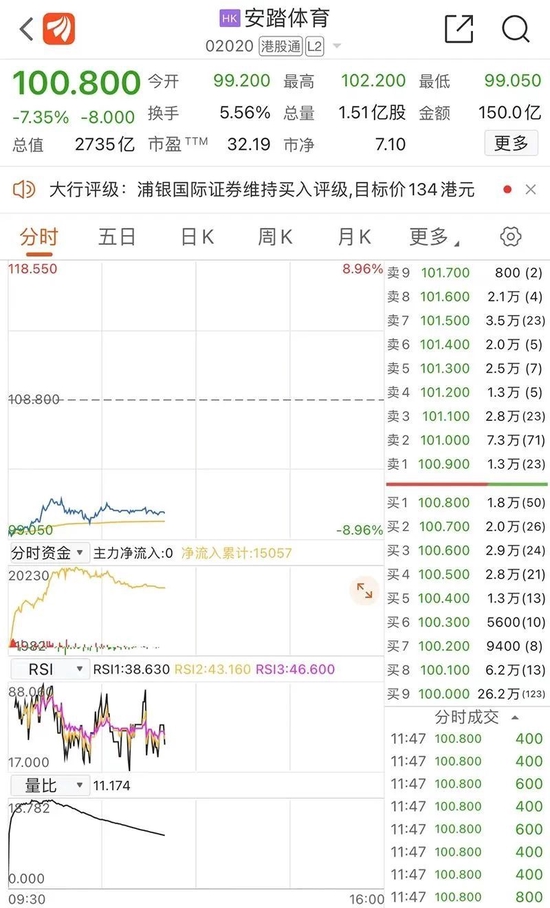 今日开盘,安踏体育跌近9%,截至发稿跌7.35%,报100.8港元/股。