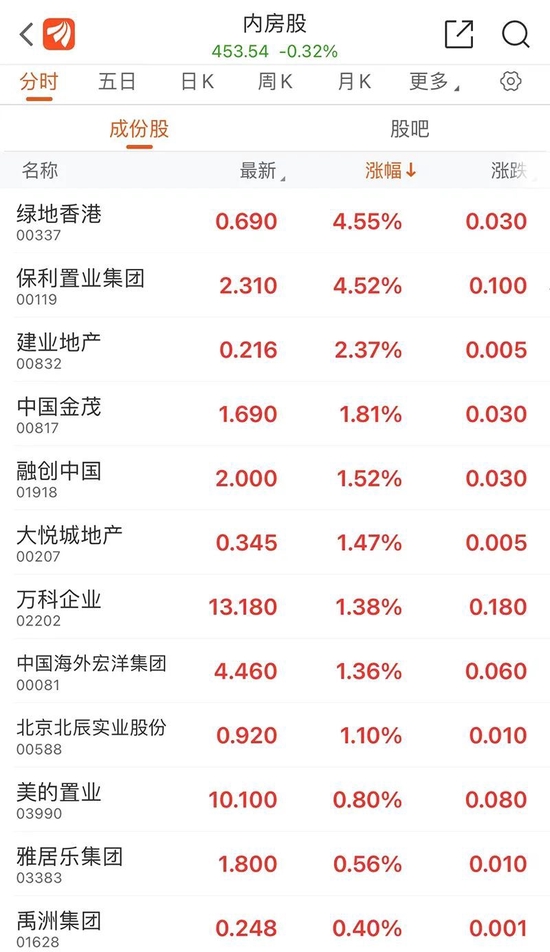港股内房股开盘后普遍走高。截至发稿,绿地香港涨4.55%,保利置业集团涨4.52%,建业地产涨2.37%,中国金茂涨1.81%。