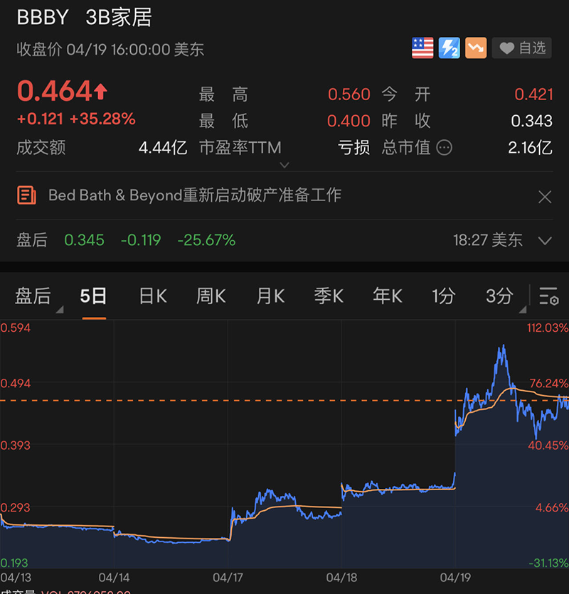 个股方面,3B家居股价昨日大幅走高,涨幅超35%,为连续第三个交易日上涨。据交易平台Capital.com称,3B家居的上涨是由社交媒体上散户的投机行为所推动的,涨势不太可能持续。此前该公司披露出售了超过1亿股股票。这家试图避免破产的零售商表示,它寻求在4月26日之前筹集3亿美元。