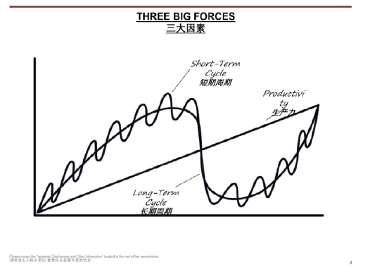 这中间向上的斜线,就是一般由于技术推动的生产力提高而发生的改变。另外两条线反映了短周期和长周期,它会围绕这个上升趋势有些大幅的波动。比如说短期的信贷债务的周期,也叫经济周期或商业周期,包括经济疲软和通胀下降,我们称之为衰退。这导致央行刺激信贷增长和经济增长,最终会导致通货膨胀,会使得央行收紧货币和信贷,然后再次导致衰退的信贷债务经济的问题。这个周期周而复始,我们处于其中。