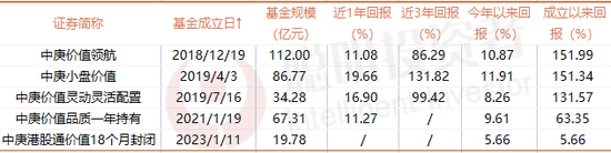 其中,最早成立的中庚价值领航涨了10.87%。自2018年12月19日,该基金成立以来回报为151.99%。