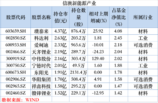 从持仓情况来看,以冯明远的代表作信澳新能源产业为例,该基金一季度增持璞泰来,较去年末加仓25.92%,目前持有股数876.4万股,持有市值为4.37亿元,仍位列第一大重仓股。