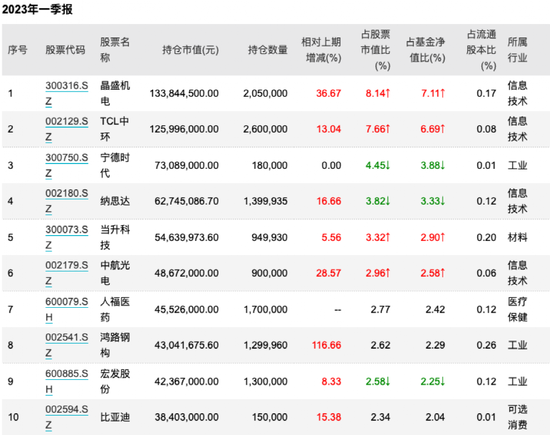 一季度,王睿减表示持了部分短期达到目标价的相关品种,并根据收益率预期的变化调整了一部分科技持仓。具体来看,以其代表作中信保诚创新成长为例,该基金在一季度增持了晶盛机电、TCL中环、当升科技、中航光电等个股,人福医药“新进”前十大。