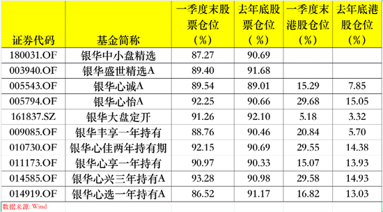 其中,银华中小盘精选、银华盛世精选A、银华大盘定开、银华丰享一年持有、银华心选一年持有A 在今年一季度小幅减仓,其中,减仓幅度最大的是银华心选一年持有A,较去年底下降了4.65个百分点。