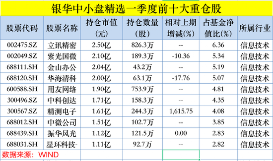 持仓方面,以李晓星代表作银华中小盘为例,前十大重仓股变动较大。今年一季度,立讯精密、金山办公、用友网络、中科创达、中微公司、星环科技-U “新进”前十大。其中,“果链”龙头立讯精密成为第一大重仓股,截至一季报,该基金持有立讯精密826.3万股,持有市值约2.5亿元。 一季度,该基金还增持了精测电子,较去年底增加了16倍,目前持有市值约1.61亿元,新晋成为第7大重仓股。值得注意的是,上述“进新”个股大多数是AI相关概念股。