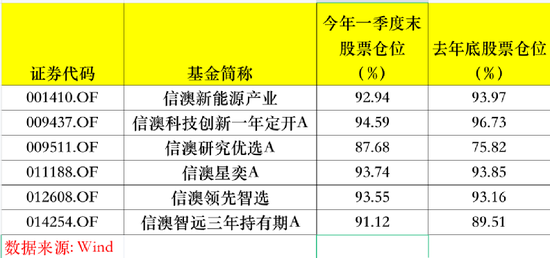 一季报数据显示,信达澳亚基金冯明远在管的6只基金平均仓位为92.27%,其中,信澳研究优选A的股票仓位从去年底75.82%上升到今年一季度末87.68%,信澳新能源产业、信澳科技创新一年定开A、信澳星奕A则不同程度小幅减仓。