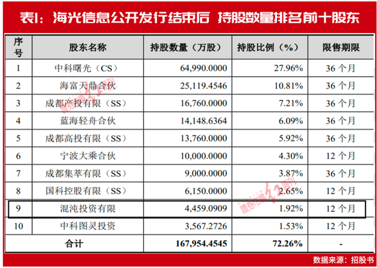 资料显示,2020年7月,混沌投资以近5亿元对价认购海光信息4459.09万元注册资本。在海光信息公开发行结束后,混沌投资以4459.09万股的持仓量位居第9大股东(见表1)。