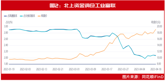 在工业富联披露的2022年四季度股东持仓中,代表北上资金的香港中央结算有限公司对其增仓9722.65万股至56874.94万股。2022年四季度期间,工业富联股价持续横盘震荡,区间涨幅不足10%。今年以来,在工业富联股价持续大涨之际,北上资金则转手开启了获利卖出模式,截至目前,北上资金的持仓量已降至4.1亿股,相较于年初减仓达1.5亿股,持股占比由年初的2.87%降至2.07%(见图2)。