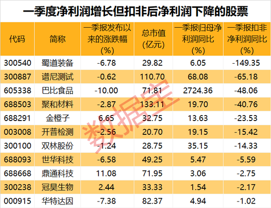 结合公司的扣非净利润来看,这152家上市公司中,有11家上市公司的扣非净利润同比呈现下降,且绝大多数个股在发布一季报后,股价均录得下跌。