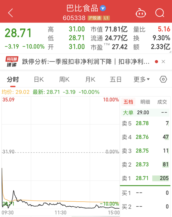 巴比食品今日开盘后股价直线下挫,最终跌停收盘。公司昨晚发布了一季报业绩,实现营收3.2元,同比增长3.24%;归母净利润4103.2万元,同比增长2724.36%。