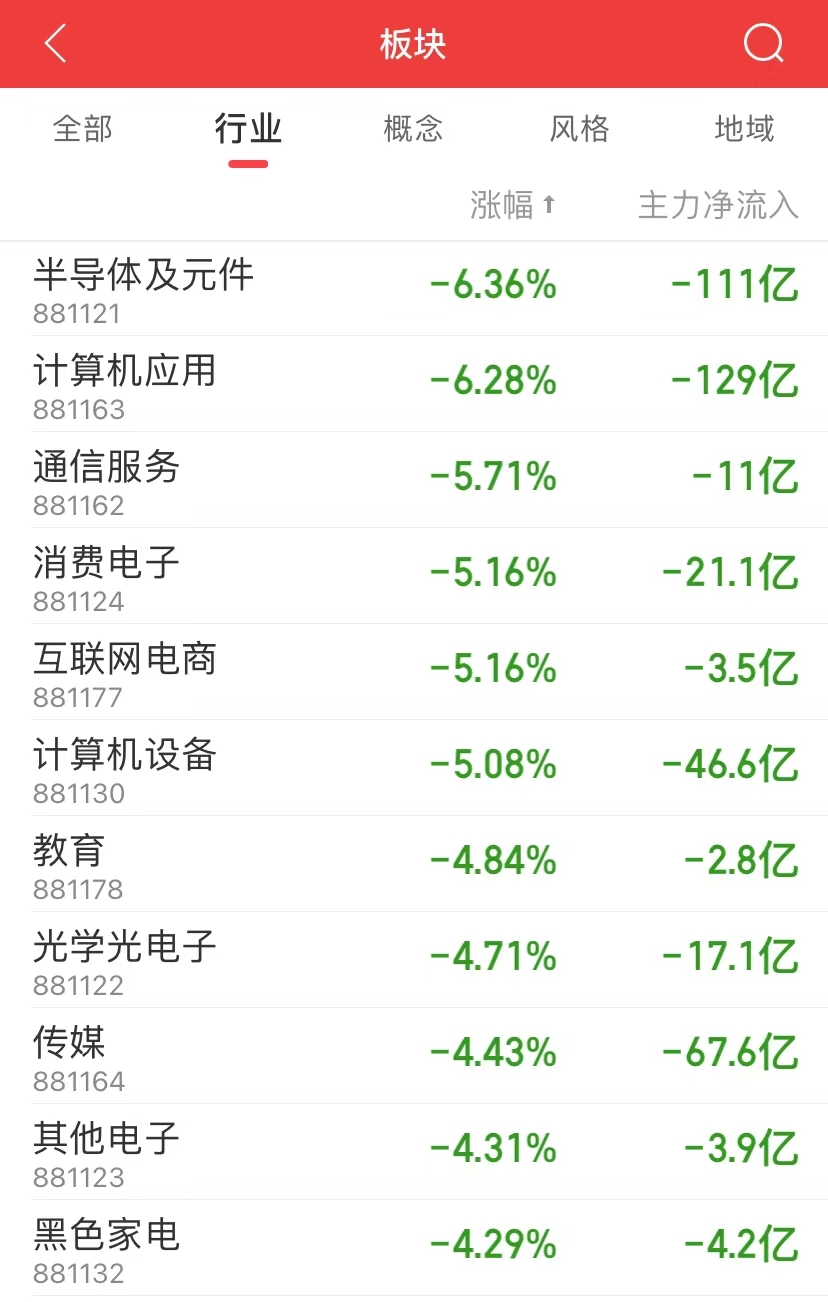 跌幅前五的行业分别是半导体、计算机应用、通信服务、消费电子、互联网电商。