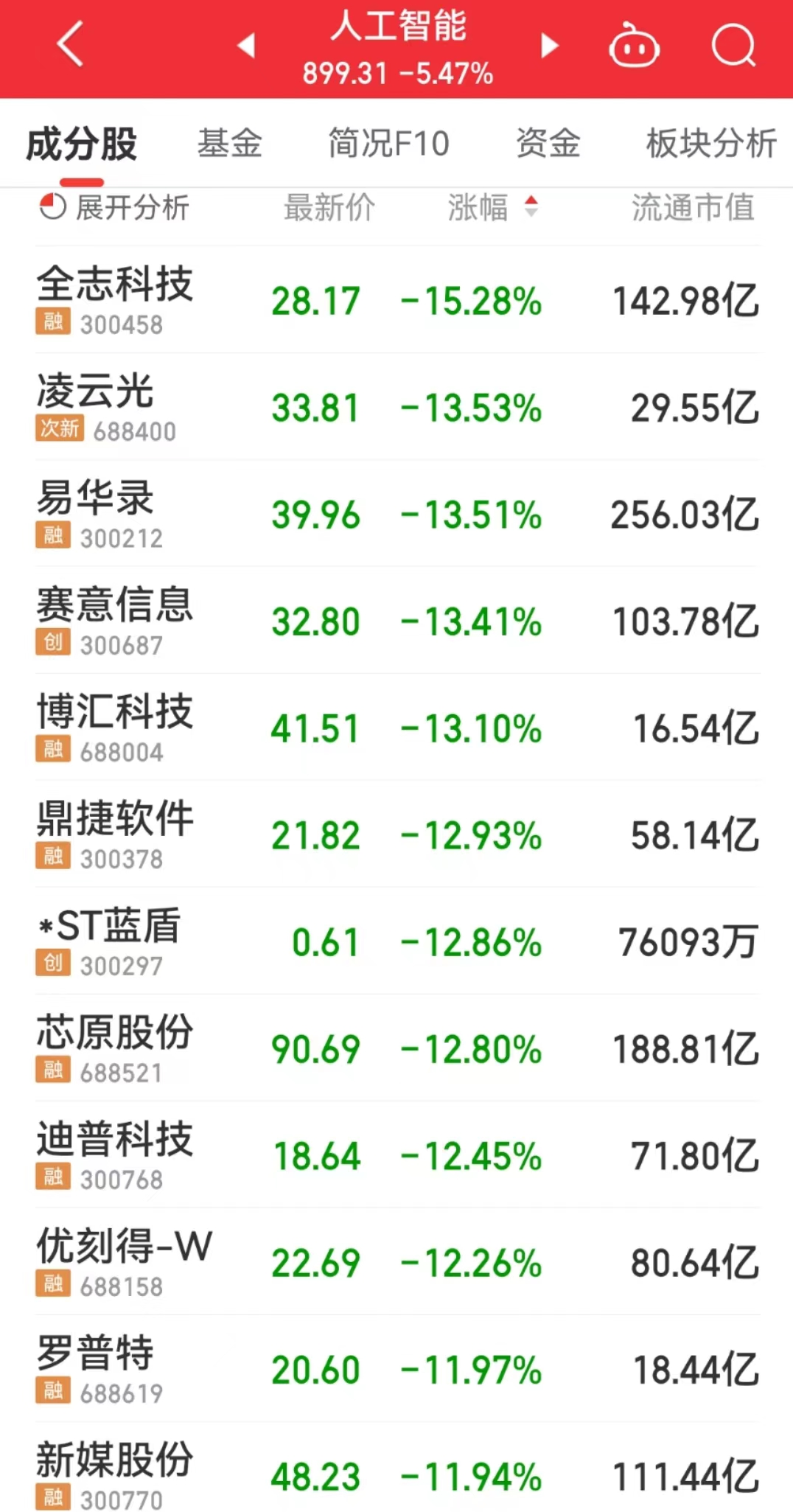 AI概念股集体大跌,易华录、云从科技等跌超10%,深桑达A、太极股份等跌停。半导体板块全天弱势,全志科技、芯原股份等多股跌超10%。