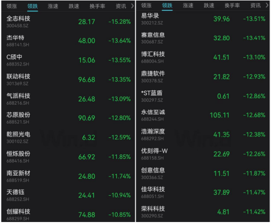 盘面上看,A股超4500只个股下跌,长江一级行业无一飘红,超170只个股跌超9%。AI概念股集体大跌,数据要素、ChatGPT、算力等方向领跌,易华录、云从科技等跌超10%,深桑达A、太极股份等跌停。半导体板块重挫,全志科技、芯原股份等多股跌超10%。