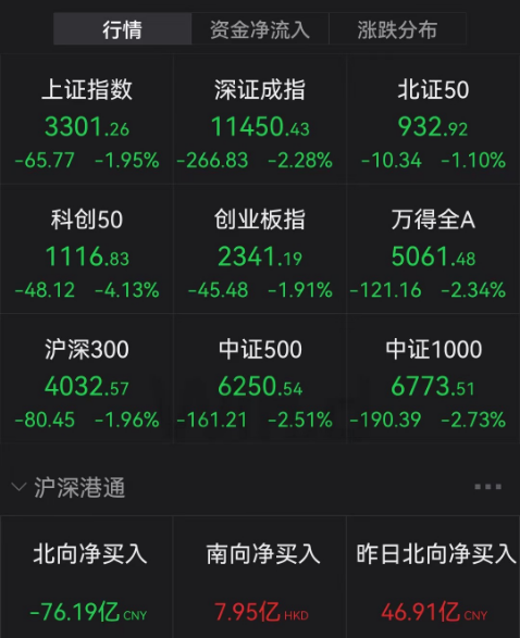 截至收盘,沪指跌1.95%,险守3300点,深证成指跌2.28%,创业板指跌1.91%,科创50指数跌超4%。北向资金全天净卖出76.19亿元,其中沪股通净卖出42.27亿元,深股通净卖出28.92亿元。值得注意的是,北向资金单日净卖出额创今年以来新高。