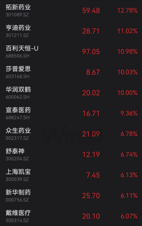 作为资金转入防御目的地之一的医药股,今日震荡反弹,新冠药方向表现突出,拓新药业、亨迪药业涨逾10%,华润双鹤涨停,智飞生物涨逾5%。