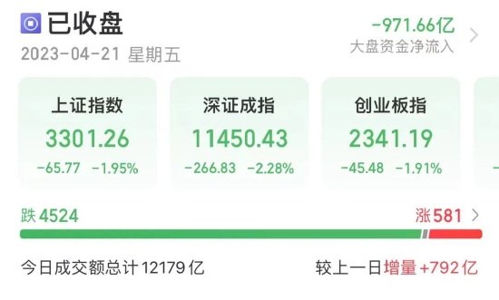 今日,A股三大股指集体收跌,沪指跌1.95%,深成指跌2.28%,创业板指跌1.91%,另外,科创50指数跌4.13%。两市合计成交12179亿元,北向资金净卖出76.19亿元。