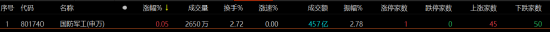 盘面上,31个申万一级行业中,仅国防军工板块一枝独秀,盘中冲高回落,收盘微涨0.05%,其余30个行业板块飘绿。