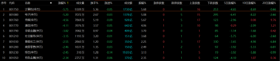 下跌方面,今日TMT(计算机/通信/传媒/电子)行业大幅下跌。从申万一级行业指数来看,计算机、电子板块跌超5%,传媒、通信板块跌超4%,非银金融、社会服务跌超3%。