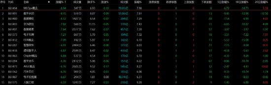 从概念板块来看,AI概念股集体大跌,易华录、云从科技等跌超10%,深桑达A、太极股份等跌停。半导体板块全天弱势,全志科技、芯原股份等多股跌超10%。具体来看,MLOps概念、数字水印、数据确权、华为欧拉、数据要素、电子车牌、EDR概念等概念板块跌幅居前。