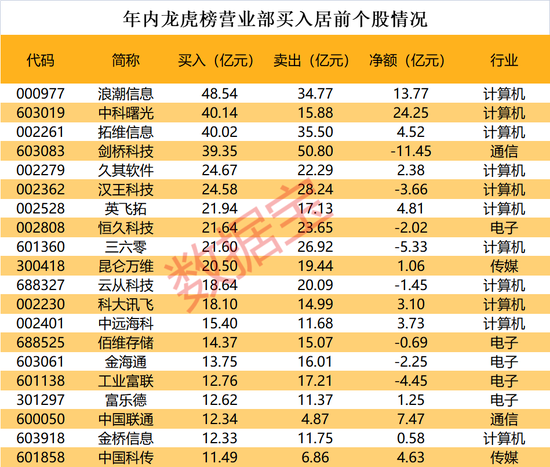 从营业部买入个股金额来看,年内浪潮信息、中科曙光、拓维信息、剑桥科技等20股获游资买入金额居前,其中浪潮信息、中科曙光、拓维信息买入金额超40亿元。