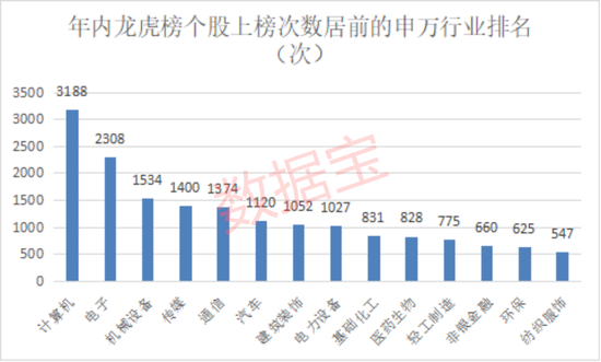 今年以来龙虎榜上榜次数最多的是计算机板块,其次是电子板块,传媒和通信板块排名第四和第五。