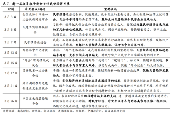 结构性政策的关键词或为科技、防范化解金融风险及民营企业。年初以来人工智能带来新一轮产业科技革命,3月16日《党和国家机构改革方案》部署十九条改革措施,重点为金融体制、科技体制的改革,其中科技领域要求组建中央科技委员会、重新组建科学技术部、组建国家数据局,意味着科技在国家战略地位的组织化和长期化;此外本次机构重组中金融体制涉及8项改革,突出中央对金融领域的监管力度,防范化解金融风险是重点。此外,3月以来李强总理民企调研场景增多,调研路线聚焦先进制造业,鼓励支持民营经济的信号从政策方针落实到实际工作中,后续支持民间投资、民营企业的举措有望仅一路落地。