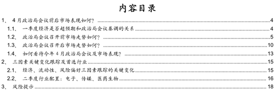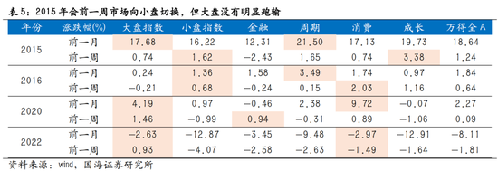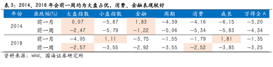 2、4月政治局会议召开前市场多呈现震荡调整态势,会前一周大盘风格占优概率更高,小盘跑赢只出现在政策基调延续宽松,如2015年、2016年,亦或是强产业周期加持年份,如2013年;行业风格层面消费、金融风格占优概率更高。
