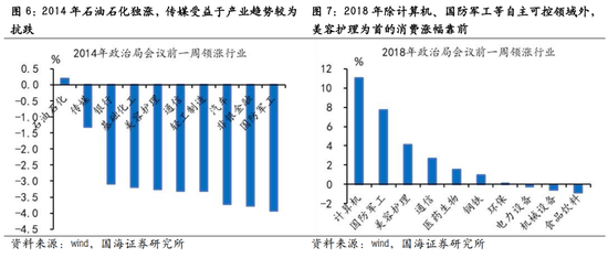 政治局会议的政策基调由紧转松的年份为2014年、2018年,经济下行以及2018年贸易摩擦是政策转松的核心原因,风格表现上,两时期会前一周均为大盘占优,消费、金融表现较好。两次政治局会议政策基调由紧转松都是在经济压力下行的背景下,2018年3月中美贸易摩擦使得 “提振内需”的政策目标上一台阶,政策基调较此前出现边际转松的迹象。从市场走势看,两时期会前均处于调整阶段,2014年会议召开前1个月、前1周万得全A涨跌幅分别为-3.2%、-4.3%,2018年会议召开前1个月、前1周万得全A涨跌幅分别为-1.4%、-3.3%。从风格表现看,2014年会议召开前,大盘风格和金融持续占优,2018年政治局会议召开前一个月,市场风格小盘占优,计算机、国防军工带领成长风格表现出色,其背后主要受贸易摩擦背景下自主可控、信息安全产业战略驱动,而政治局会议召开前一周,市场风格转向大盘,消费、金融较为抗跌。从会前一周的行业表现看,2014年石油石化独涨,传媒受益于产业趋势较为抗跌;2018年,除计算机、国防军工等自主可控领域外,美容护理为首的消费涨幅靠前。