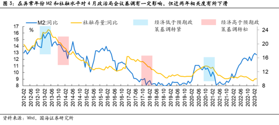 在异常年份M2和社融水平对4月政治局会议基调有一定影响,但近两年相关度有所下滑。将一季度经济水平与政策基调背离的年份看作异常年份(即经济低于预期政策转紧或经济高于预期政策转松),过往10年共出现过4次,分别为2013年、2014年、2018年和2021年。其中,前三次4月政治局会议基调与一季度M2和社融增速情况负相关,即在一季度货币和信用水平环比改善的情况下,政策收缩,货币和信贷水平环比下滑时,政策转松。但近两年这一相关性也有所减弱,例如2021年一季度经济低于预期且货币和信用水平下滑,但2021年4月政治局会议基调仍延续收紧。