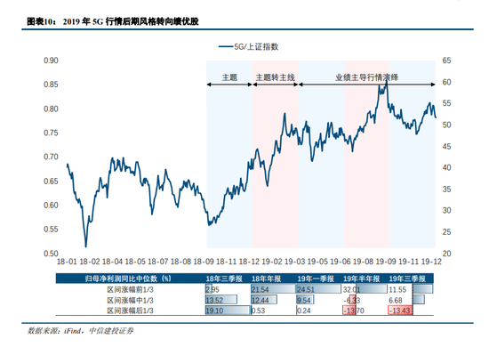 再看2019年以5G主题为核心的科技股行情,第一阶段主题的炒作风格明显偏向绩差股(以及小盘股),个股涨幅和盈利增速呈现显著的负相关性;而在第二阶段,板块内的许多个股业绩出现了明显的上行,炒作风格随即转向绩优股,个股涨幅和盈利增速呈现显著的正相关性;而在后续的或是震荡或是上行的行情中,绩优股始终涨幅领先。