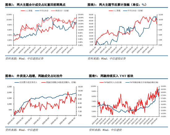 我们之前提示“一轮科技股行情从主题投资演绎到主线的过程中,会经历机构的多轮加仓,市场对于科技板块的认知会从初步尝试到形成共识再到认知成熟不断深化。短期来看,板块热度攀升,交易集中度过高、交易结构不健康的确会加剧后续波动风险”。本周前期两大热门主题AI与中特估轮番演绎,周五AI主题大幅下挫。部分如外部科技制裁等传闻可能扰动投资者情绪,带来风险偏好的收缩,同时,两大主题合计成交占比再回前期高点,交易拥挤度重新攀升,加之前期主题涨幅过高(以万得人工智能指数为例,春节后至本周四累计涨幅44.69%),部分交易型资金获利颇丰,量化资金和融资盘可能也放大了AI主题乃至TMT板块相关公司的波动性。随着年初以来外资持续买入趋势的放缓,公募基金发行低迷,但部分量化私募持续迎来新增资金,另外,3月下旬以来,两融交易额占全市场成交比重中枢逐步抬升,4月6日占比一度接近10%,而TMT板块中融资买入占整个板块成交比例同样不断攀升,尽管近期有所回落。另一个有利的证据是,TMT板块两融余额占全市场两融余额的比例自3月下旬以来快速上升,即表明近期不断流入的两融交易者中,大部分正在选择加速涌入TMT板块。