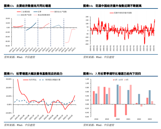 同样需要看到的是,服务业与部分接触型消费的脉冲式复苏是GDP超预期背后的重要推动力,其或许更多源于疫后消费场景的修复,是居民部门积压需求释放、“报复性消费”的一种体现,这一逻辑对于解释地产销售的大幅改善可能同样有效。而需要考虑的是,当脉冲过后亦或外生场景边际改善的趋弱,作为顺周期变量的消费或许依旧需要依赖于居民部门收入预期恢复下内生需求的提升。如果剔除基数效应并基于较疫情前复合增速或是社零季调环比的视角,3月单月消费改善幅度可能并不如所展现的那般强劲。在本周发改委举行的新闻发布会上,其表示正抓紧研究起草关于恢复和扩大消费的政策文件以促进消费的持续恢复,或同样验证后续复苏压力与动力并存,我们依然维持年度策略中提示“慢复苏”格局下“复苏小牛”的观点。
