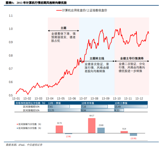 复盘2013年的计算机应用板块,我们也发现了类似的规律,即行情前期预期推动阶段绩差股占优,在板块业绩整体上行后风格转向均衡,而在业绩二次验证后板块高位震荡的过程中,绩优股显著占优,亦即更扛跌。