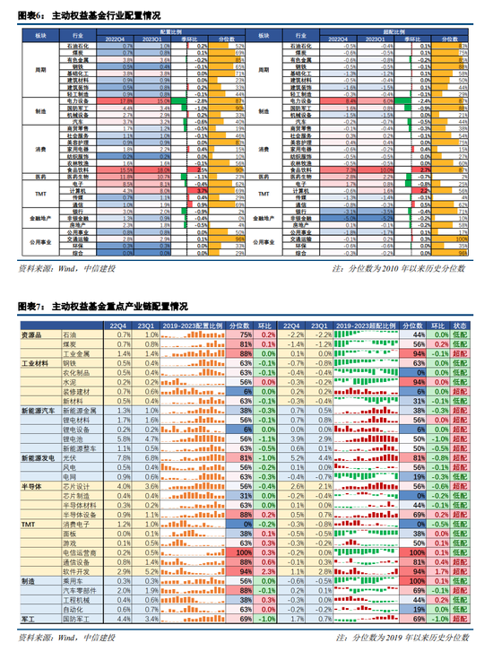 同时,从机构配置水平看,TMT在一季度虽然得到公募加仓,但并未达到高拥挤的水平。一季度公募基金重仓股结构显示:新能源明显减配,TMT和食品饮料配比提升。行业配置情况来看,电力设备行业明显减配,滑落至第二大重仓行业,配置比例下降2.8pct,超配比例下降2.4pct,但配置比例和超配比例仍处于2010年以来87%的较高分位数;食品饮料行业配置比例提升2.5pct,超配比例提升2.7pct,配置比例和超配比例分位数也重回90%附近;计算机行业配置比例提升3.7pct,超配比例提升2.7pct,TMT板块整体配置比例提升4.6pct,超配比例提升1.8pct。此外家电和交运行业增配较多,军工、电子、医药、汽车行业减配较多。