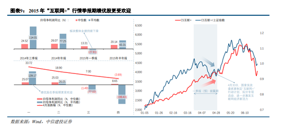 2015 年的“互联网+”行情中,我们注意到,当时一季报期板块盈利同比无论是中位数还是平均数都发生了显著下滑,“互联网+”板块虽然仍在上行:但从板块指数相对上证指数的表现来看,“互联网+”板块在季报期显著跑输大盘。整体来看,“互联网+”板块在季报期过去后叠加政策利好才体现了相对收益。且如果把季报期“联网+”板块个股按涨幅由高到低分为四组,我们会发现个股涨幅和盈利增速总体上呈现正相关性。最后,我们认为当前的市场环境不会复制 15 年极端主题泡沫的行情。