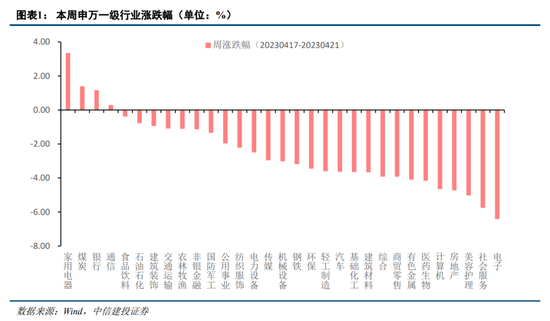 主要指数全面收跌,大盘价值相对占优。周一权重股发力带动指数突破,而后市场连续回调,万得全A周五大幅下挫2.34%。具体各主要指数来看,偏大盘与价值风格的上证50表现相对占优,微跌0.93%;上证指数、沪深300与科创50分别收跌1.11%、1.45%和1.71%,大盘价值风格一枝独秀,全周上涨1.32%;小盘风格与成长风格跌幅较大,国证2000、创业板指分别下跌3.90%、3.58%。31个申万一级行业跌多涨少,全周仅家用电器、煤炭、银行和通信板块上涨,分别涨3.35%、1.39%、1.17%和0.29%;电子、社会服务和美容护理跌幅居前,分别跌6.41%、5.75%和5.03%。