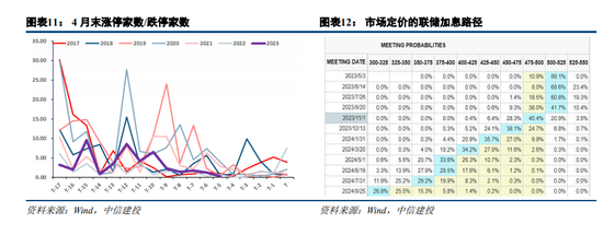 1)4月末的业绩暴雷风险。4月下旬年报和一季报披露接近尾声,业绩较差或不及市场预期的公司往往可能倾向于延后公布自身财报,由此导致4月末财报季“业绩暴雷”事件容易频发,市场投资者风险偏好收缩,情绪可能趋于谨慎。参考过去六年4月中下旬涨跌停家数比例以简单衡量市场做多情绪,可以发现4月末涨跌停比例快速下降,因此可能不是一个好的主题投资窗口期。
