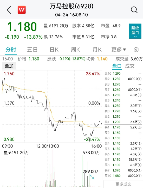 4月24日,万马控股早盘高开港元,随后一度冲高逾22%,午后股价快速转跌,尾盘跌幅扩大至28.47%,全天振幅超55%。最终收于1.18元,跌13.87%,换手率达13.76%。