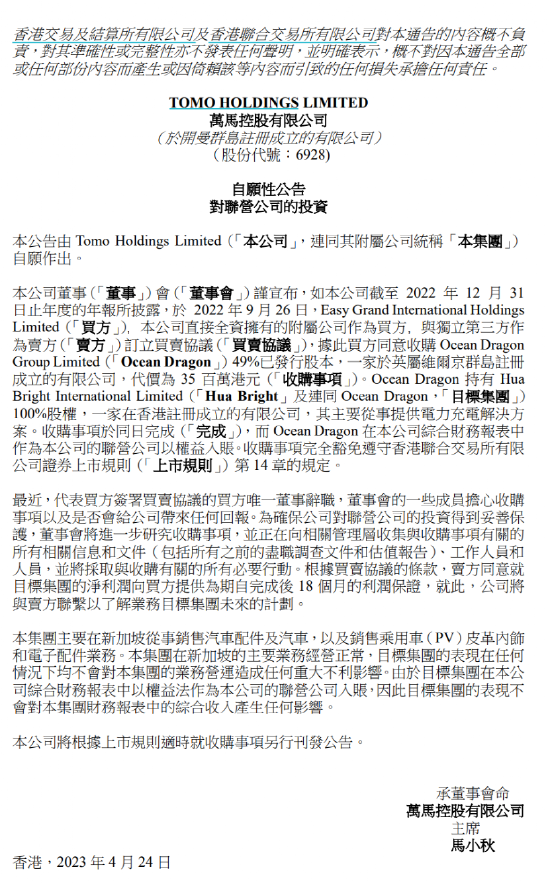 万马控股发布公告表示,有关其全资附属Easy Grand International以3,500万元代价收购Ocean Dragon的49%已发行股本,后者持有从事提供电力充电解决方案Hua Bright的100%股权,公司指出,最近代表买方签署买卖协议的买方唯一董事辞职,董事会的一些成员担心收购事项以及是否会给公司带来任何回报。为确保公司对联营公司的投资得到妥善保护,公司将进一步研究上述收购事项。