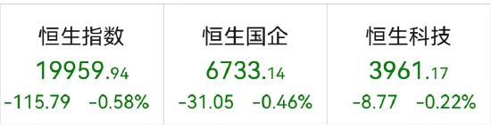 4月24日,港股小幅低开随后盘整震荡,午前快速走弱,午后跌势进一步扩大恒指一度跌1.7%,尾盘跌幅显著收窄。恒生指数收跌0.58%报19959.94点,恒生科技指数跌0.22%报3961.17点,恒生国企指数跌0.46%报6733.14点。大市成交964.4亿港元,南向资金净买入1.95亿港元。