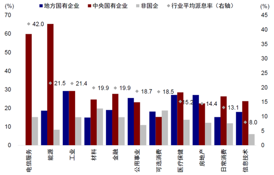 ? 港股央国企有空间提升派息比例。从行业来看,央国企电信、能源板块派息水平高于其他企业,其余板块派息水平则与其他企业相近。港股央国企存在当前派息比例相对较低的标的,例如当前派息比例在50%以下的中国中冶、中国铁建等,派息水平有进一步抬升空间。