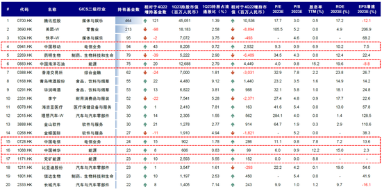 图表18:主动偏股型基金1Q23重仓港股中,部分“中特估”央国企获加仓情况明显