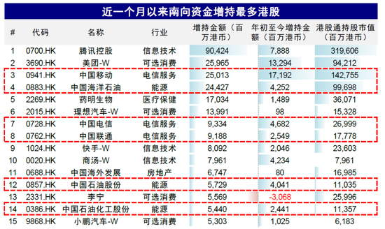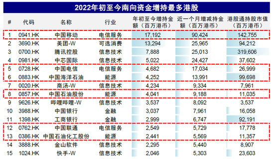 从十大活跃个股流入情况来看,年初至今有多家相关央国企标的,包括中国移动、中海油、中国电信、中国神华与中石油等明显受投资者青睐。其中中国移动年初至今获南向资金累计净流入达149亿港元,排名第一。与此同时,中海油、中国电信与中国神华也分别获南向资金买入达38亿、28亿与11亿港元,排名前十。在过去一个月中,相关标的也同样获南向投资者青睐。与此同时,从南向资金持股总额变化情况来看,中国移动、中国电信、中海油、中石油、中国联通与中石化等相关标的同样排名前列。