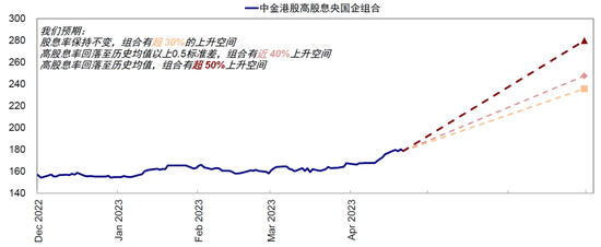 在派息率提升的前提下,我们分多种情况进行讨论:1)假设组合内标的股息率维持不变,经测算组合上涨空间30%左右;2)假设组合内标的高股息率具有进一步回落空间,回落至长期历史均值以上0.5倍标准差,组合上涨空间将近40%;2)假设组合内标的股息率回落至长期历史均值,那么组合上涨空间将超50%。
