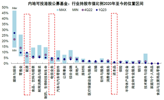 一季度老经济占比提升,能源与电信业务等相关板块提升情况明显。从主动偏股型基金1Q23持仓情况来看,高股息央国企标的集中的老经济板块持仓占比整体提升0.9个百分点,从4Q22的28.1%提升至29.0%。细分板块看,包括能源、电信业务、资本品、公用事业与原材料等在内的“中特估”热门赛道占比提升则更加明显。如果将上述五个细分板块持仓占比进行汇总,这一比例在过去一个季度内上升了5.5个百分点,从4Q22的16.6%显著提升至1Q23的22.1%。