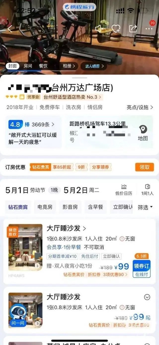 不过记者在该酒店5月1日入住已经售罄的房源中没看到99元大厅睡沙发的产品。