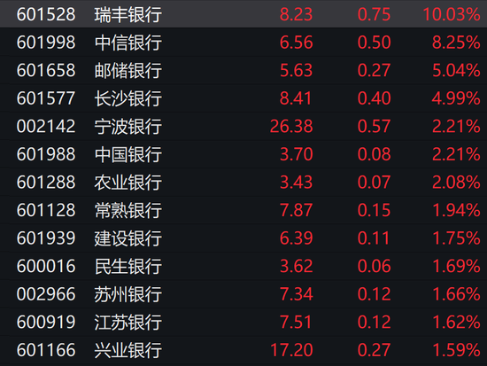 其中,瑞丰银行涨停,中信银行涨超8%。