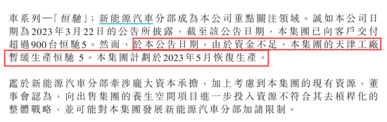 根据恒大汽车披露的信息,截至4月24日,恒大汽车已向客户交付超过900台恒驰5。然而由于资金不足,集团的天津工厂暂缓生产恒驰5,恒大汽车计划于2023年5月恢复生产。